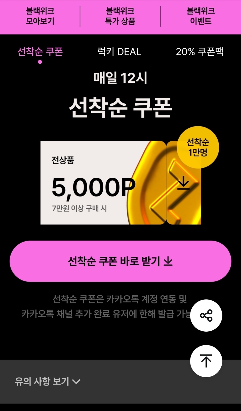블랙위크 배너를 누르면 위 화면으로 전환이 되는데요, 제일 상단의 중앙에 있는 "블랙위크 쿠폰/혜택"을 눌러주세요.