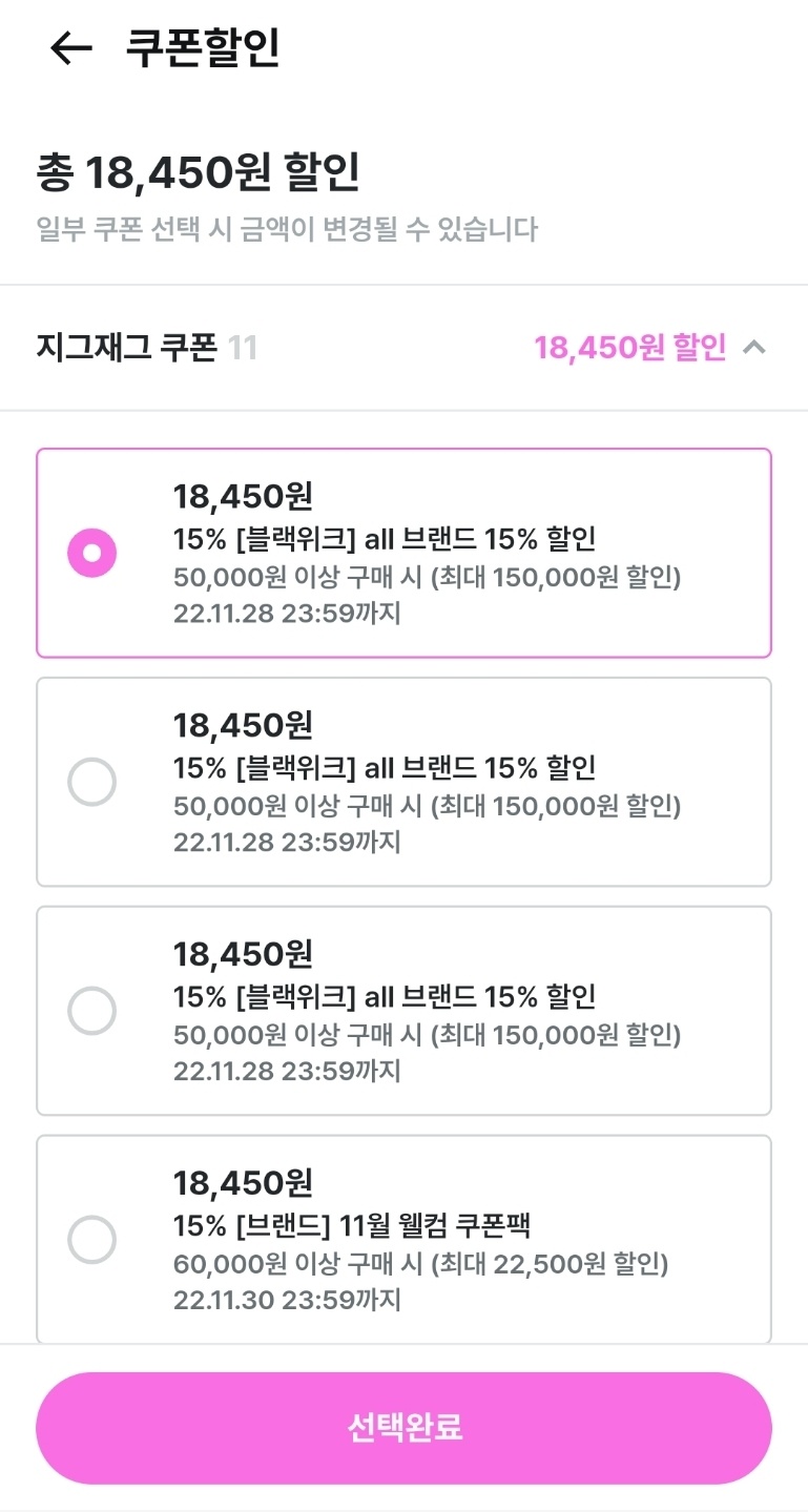 현재 상황에 적용가능한 쿠폰이 그림과 같이 자동으로 쭈르륵 뜨는 걸 볼 수 있습니다. 지그재그 쿠폰 중 가장 할인이 많이 적용되는 쿠폰을 선택한 뒤 선택완료를 눌러줍니다.
