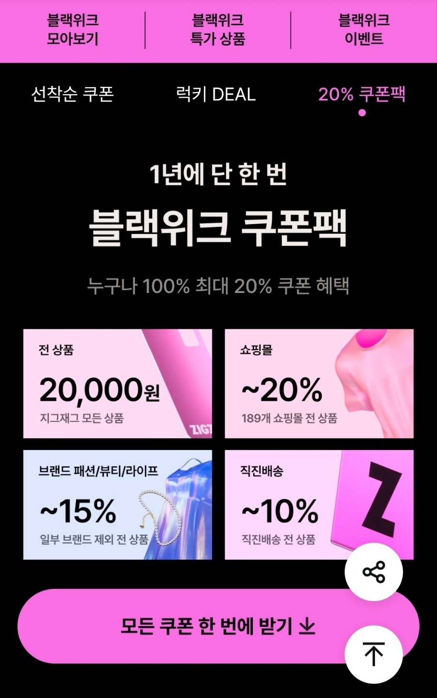 화면을 밑으로 더 내리면 블랙위크 쿠폰팩이 나옵니다. 아까 위에서 선착순 1만명 쿠폰을 못받았다 하더라도 상심할 필요가 없는 이유입니다. 여기서 "모든 쿠폰 한 번에 받기"를 눌러주세요. 20,000원 할인쿠폰, 20%할인 쿠폰 등 쏠쏠한 쿠폰을 많이 받을 수 있습니다. 날씨가 쌀쌀해져서 옷 쇼핑 한번 해야겠다고 생각하고 계시던 분들은 이번 행사가 쿠폰을 활용할 수 있는 좋은 기회입니다.
